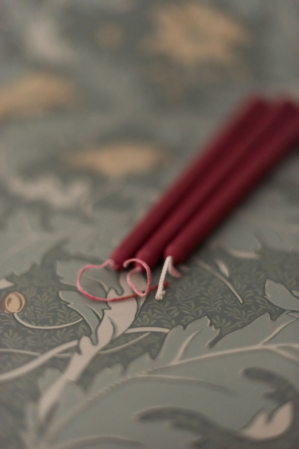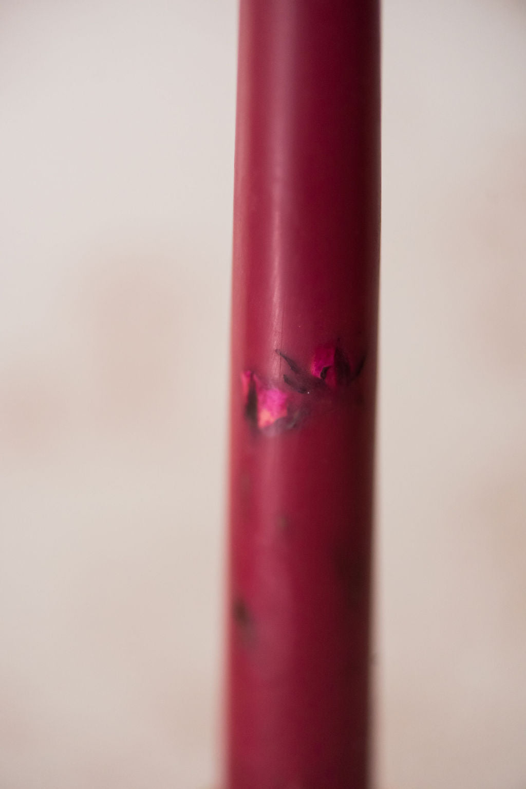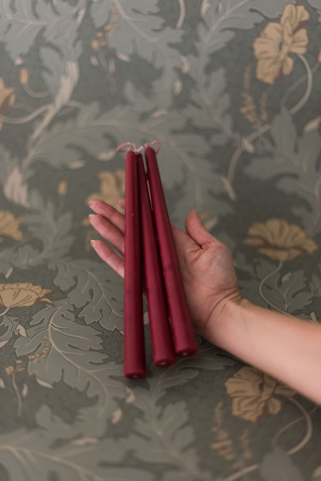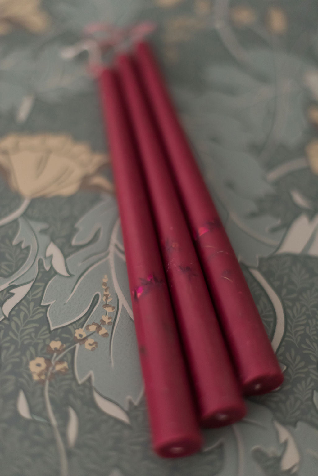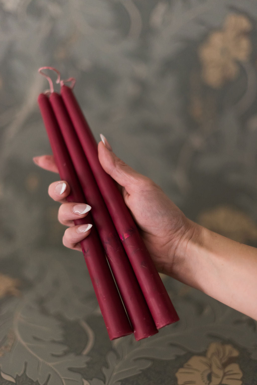 We searched and weren’t able to find floral inlaid tapered candles, so we created them! A set of three soy and beeswax candles that fit perfectly in our brass candle holders. The florals in each candle are real flowers that have been dried and placed in the wax candle. Our standard tapered candles are a burgundy colored wax and are inlaid with pink dried flowers. Dimensions: 7/8" diameter