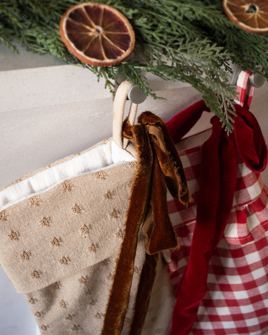 Made from our own custom-designed textiles, each stocking is sewn locally and fully lined with a soft cream fabric for a beautiful drape and lasting structure. The patterns feel collected, warm, and quietly nostalgic — the kind of details that make a room feel lived-in and loved. Available in 4 colors